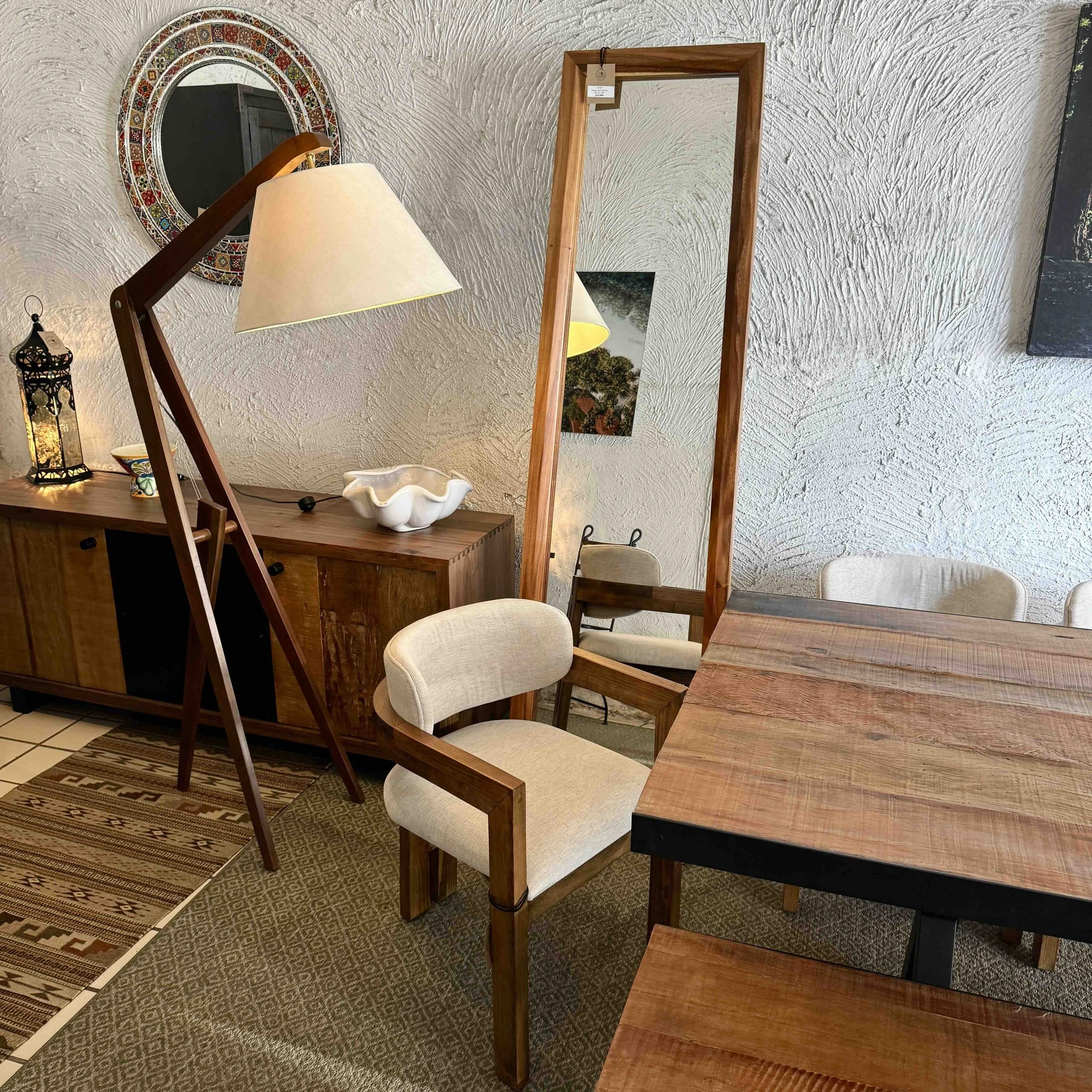 Mesa armada con tablones de madera recuperada y acentos de acero. Mesa imponente de 240x120cm para 10 personas y 200x100cm para 8 personas. La silla Convento tiene el diseño clásico de una silla de director de cine. Su estructura es de acero, el asiento y respaldo es piel.