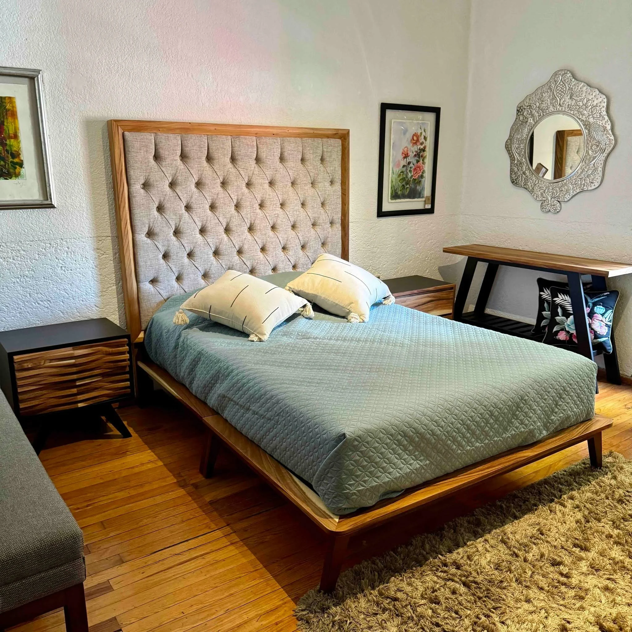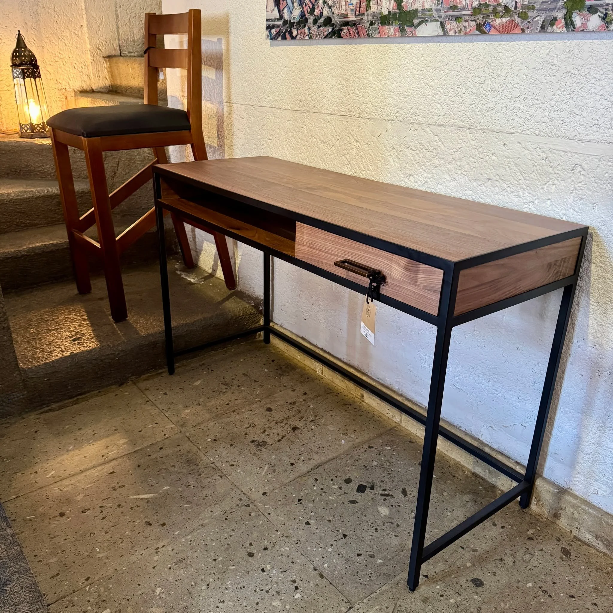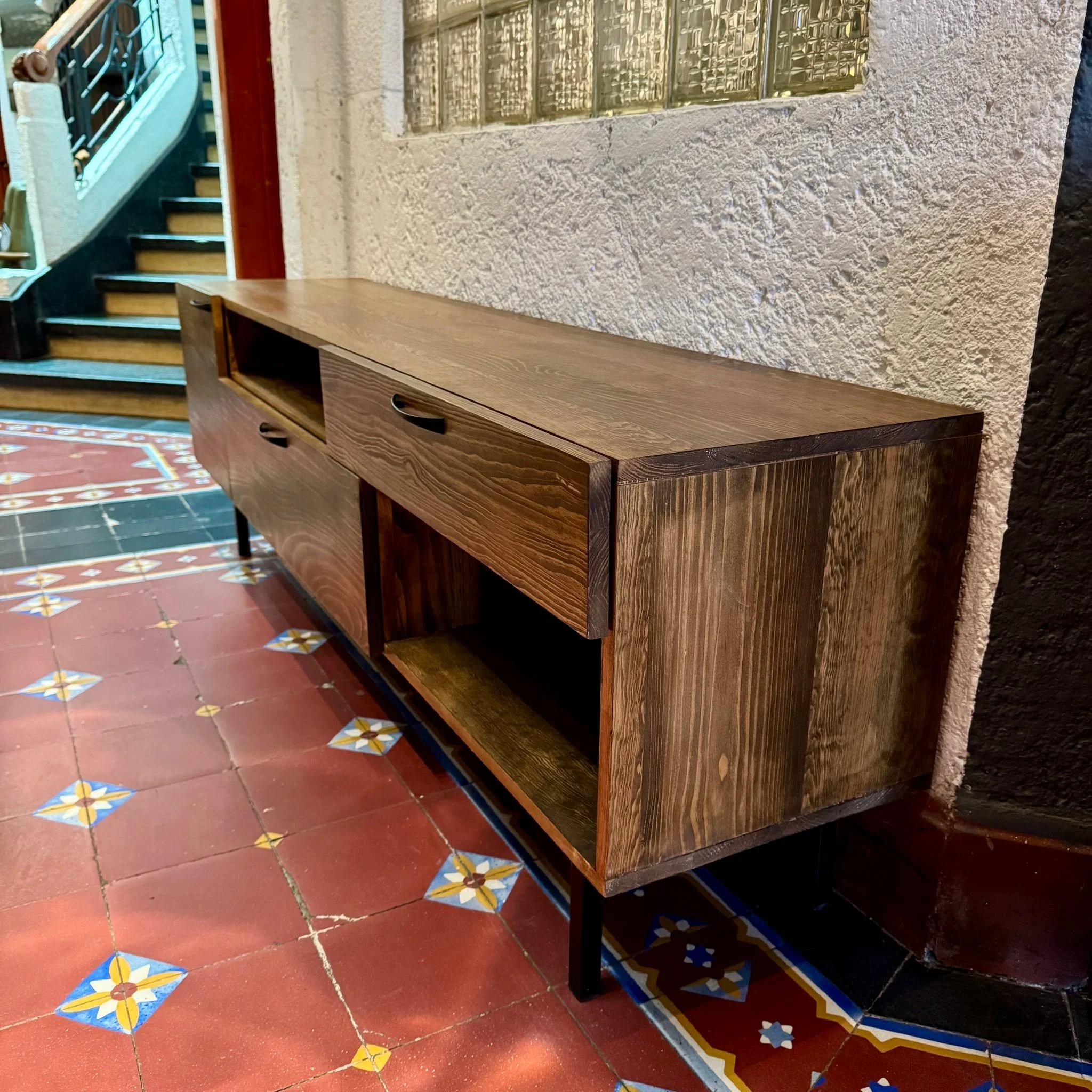 Diseño contemporánea en madera pino en tono nogal con base y herrajes de acero .