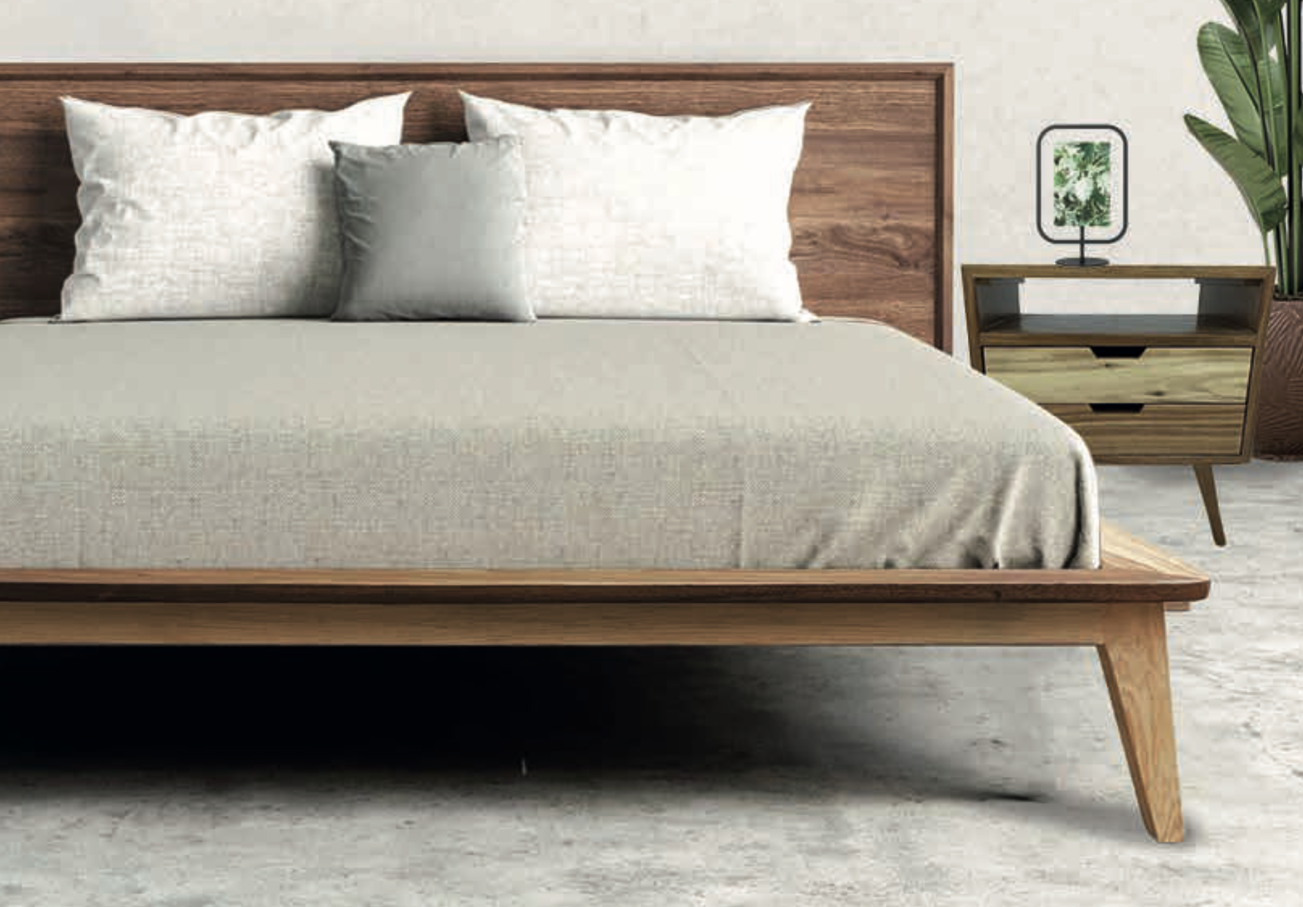 Diseño contemporáneo de alta calidad en madera parota sólida con cabecera en tela gris. Manejamos cuatro tamaños de cama: Individual, Matrimonial, Queen y King Size.